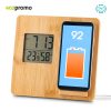 Cargador inalámbrico en bambú de 10W. Reloj digital con temperatura. Input: DC 5V — 1.5A Output 1.1A 10W. Empaque caja individual.