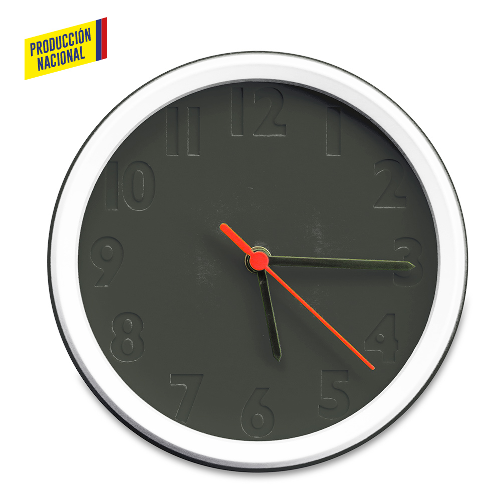 Reloj de pared con base en Poliestireno de Alto Impacto, números en bajo relieve, aro en ABS, visor en poliestireno cristal.