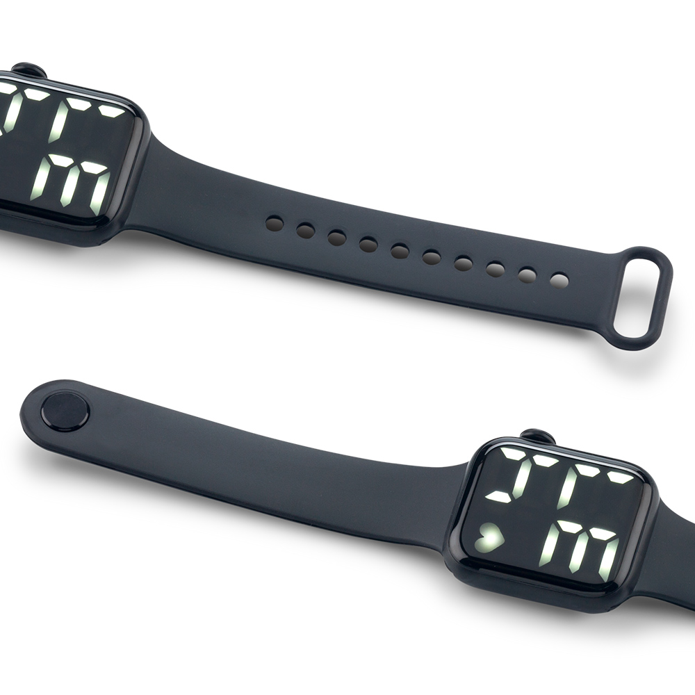 Reloj LED a prueba de agua (ip65, no sumergible). ABS, banda de TPU. Función: fecha, hora. Batería: CR2450 incorporada.