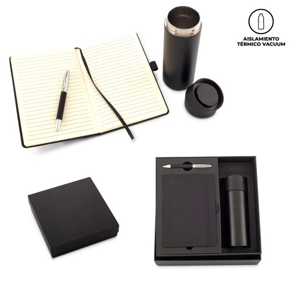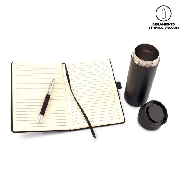 Set de libreta con tapa dura en RPET de 21 cm x 14.5 cm de 80 hojas rayadas. Botilito de 450 ml, doble pared vacuum en acero inoxidable, con aislamiento térmico que mantiene la bebida fría o caliente hasta 6h, aprox (puede variar dependiendo condiciones climáticas). Bolígrafo metálico con barril en tela y clip metálico, tipo twist. Empaque caja individual.