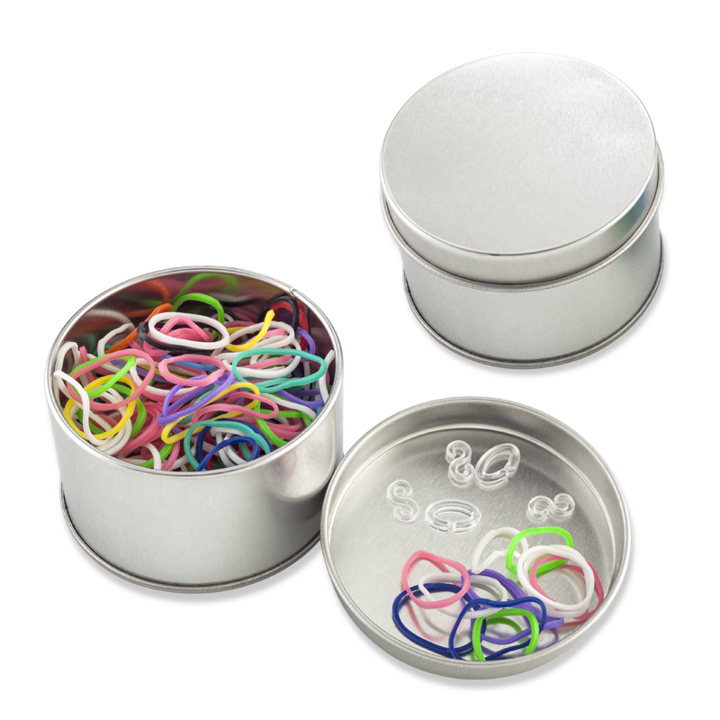 Juego de bandas elásticas y pasadores plásticos, en estuche metálico.