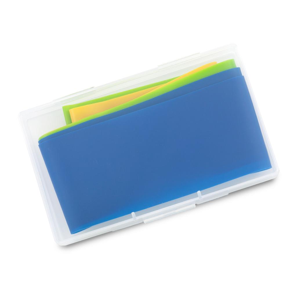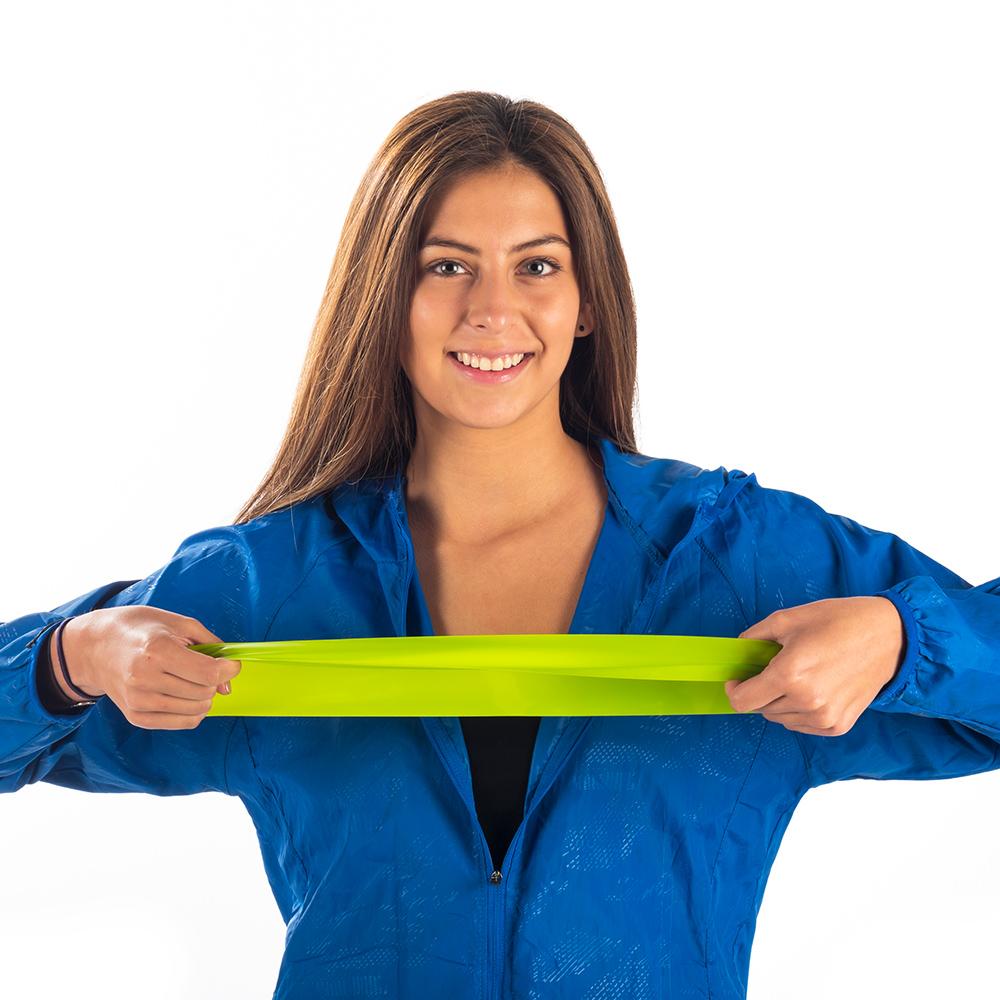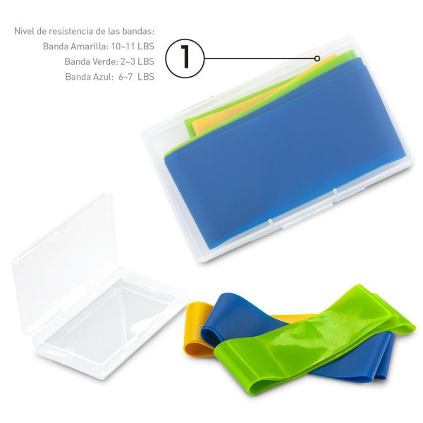 Set de tres bandas elásticas 100% látex, cada una con un nivel de resistencia diferente. En estuche plástico.