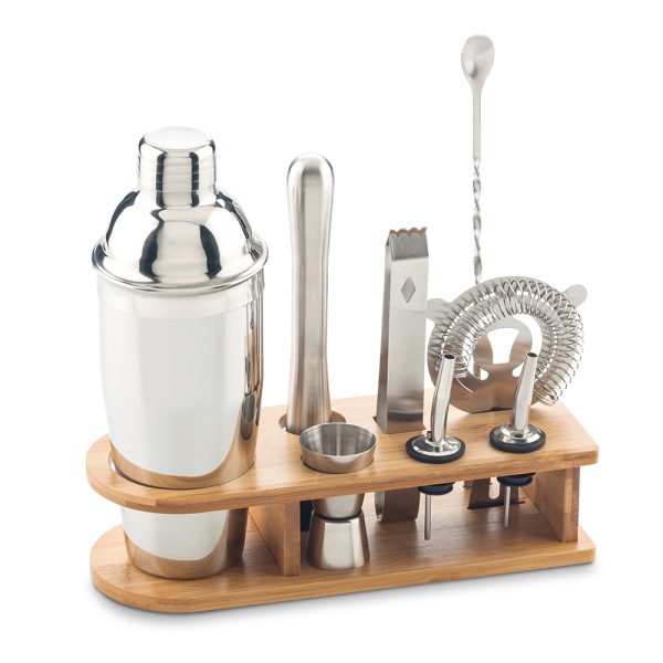 Set para cocteles en acero inoxidable, mezclador de 750ml de capacidad con base en madera. 9 piezas incluida la base. Empaque caja individual.