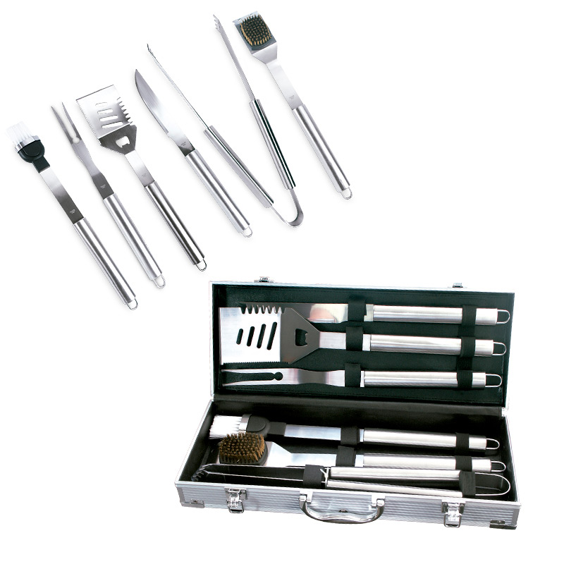 Caja de aluminio con cuchillo, escobilla, trinche, cepillo metálico, espátula y pinzas. Empaque Caja Individual.