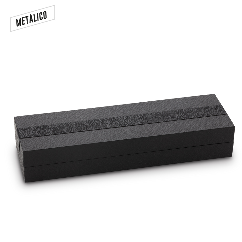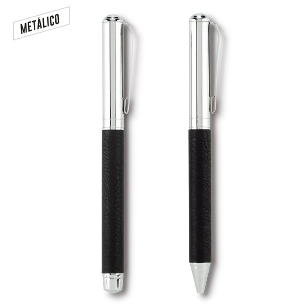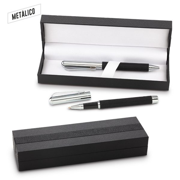 Set de bolígrafo y roller metálico con partes en poliuretano imitación cuero en estuche. Empaque caja individual.