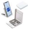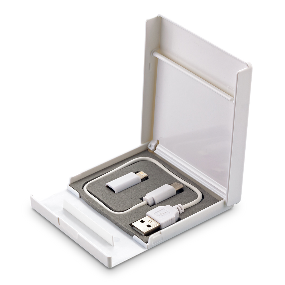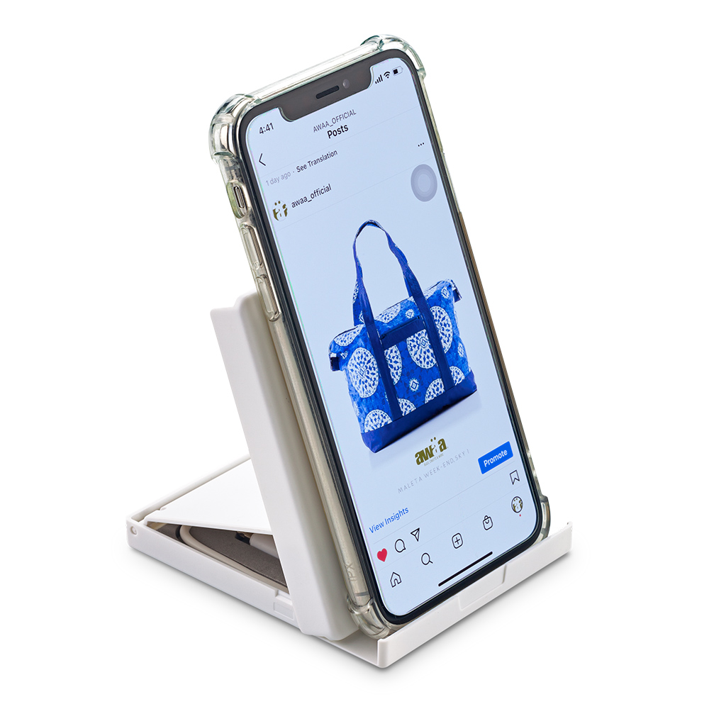 Soporte plástico portacelular con cable 2-1 y adaptador para tipo C.