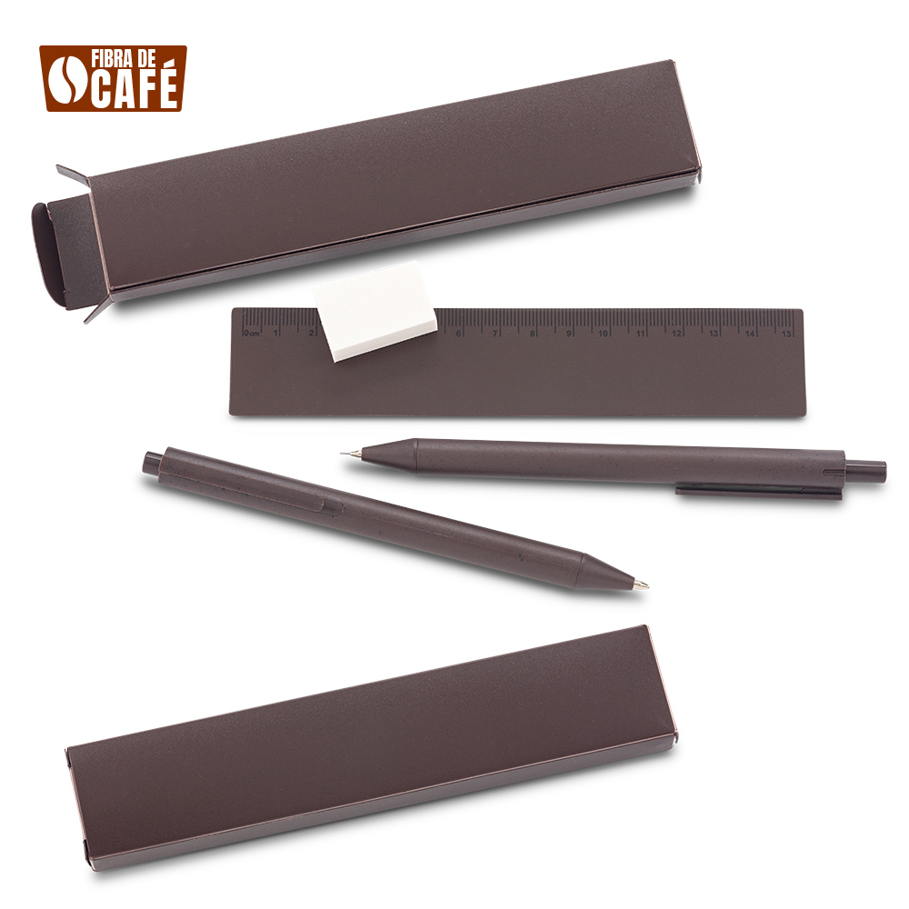 Set elaborado con un porcentaje de material ecológico: 60% ABS, 40% fibra de café. Incluye bolígrafo, portaminas (mina 0.5mm), regla, estuche y borrador blanco.