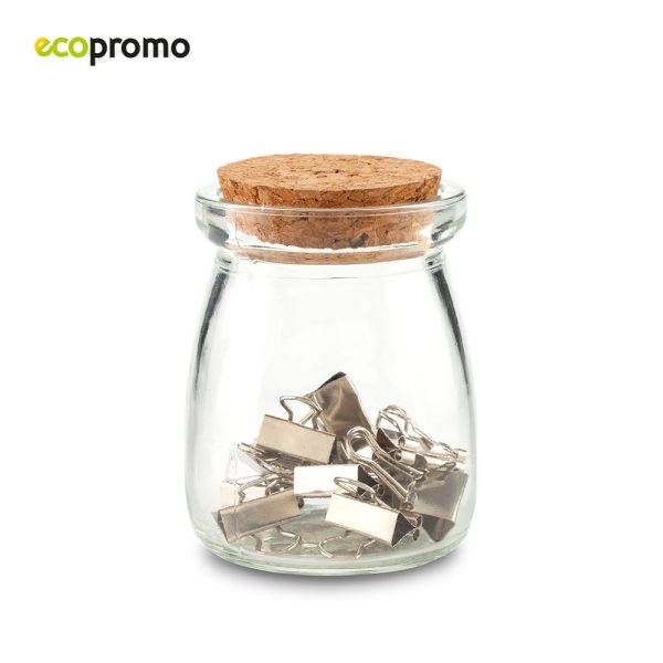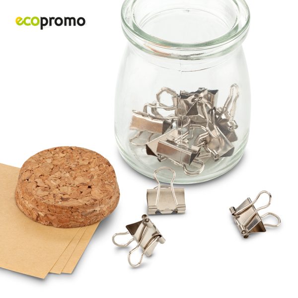 Set con clips en estuche de vidrio con tapa de corcho, con original diseño vintage. Incluye 25 clips metálicos.