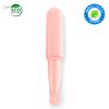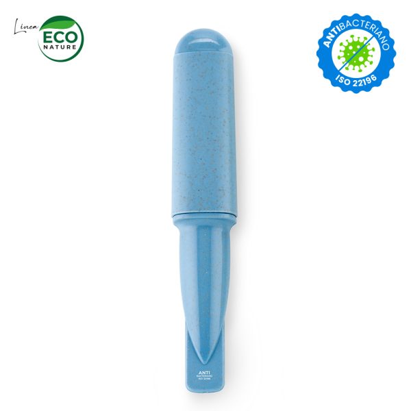 En plástico mezclado con material ecológico en fibra de trigo (50%-60% aprox). 3 en 1, incluye cuchara, tenedor y cuchillo con tapa de cierre a presión.