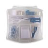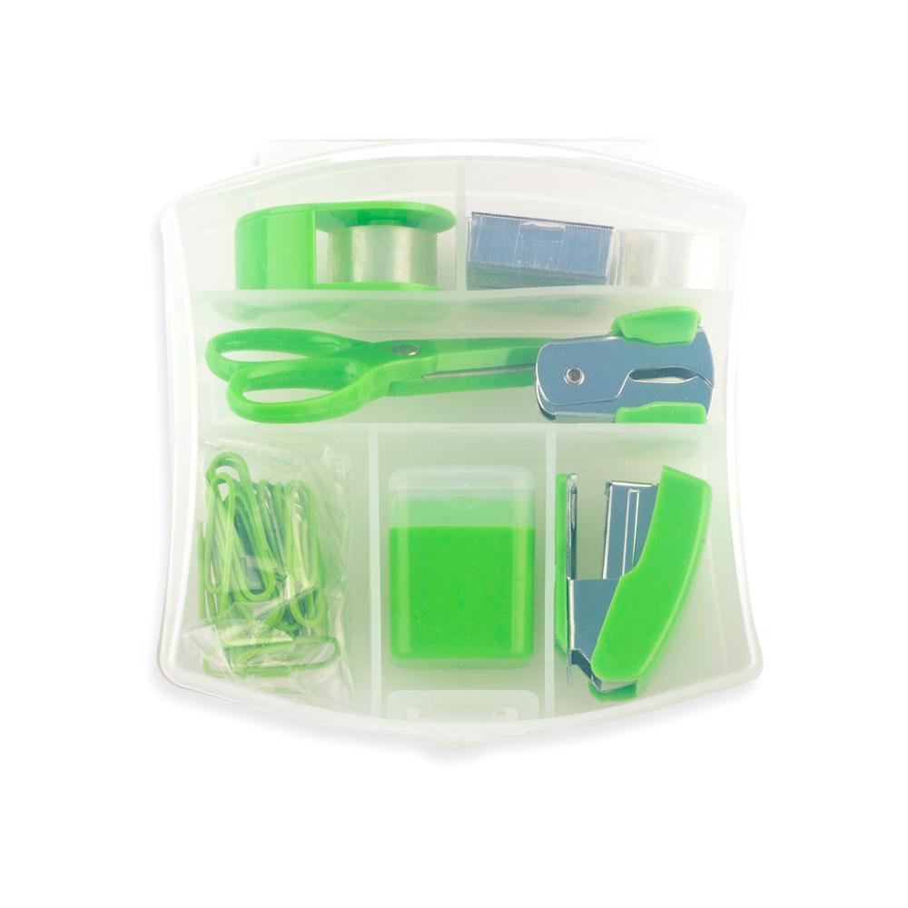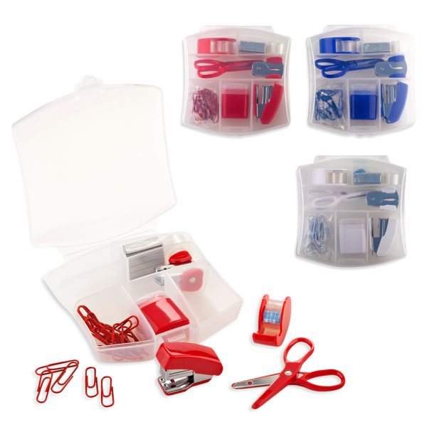 Set de escritorio plástico con cinta, repuesto de cinta, ganchos, tijeras, quita ganchos, clips, tajalápiz y cosedora.