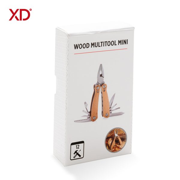 Multiherramienta compacta y duradera con 12 funciones. Carcasa de madera y herramientas de acero inoxidable de alta calidad. Incluye: alicates de punta fina, alicates normales, cortaalambres, cuchillo de sierra, navaja pequeña, destornillador, destornillador plano mediano, destornillador plano pequeño, destornillador plano grande, navaja, lima y pulidora. Empaque caja individual.