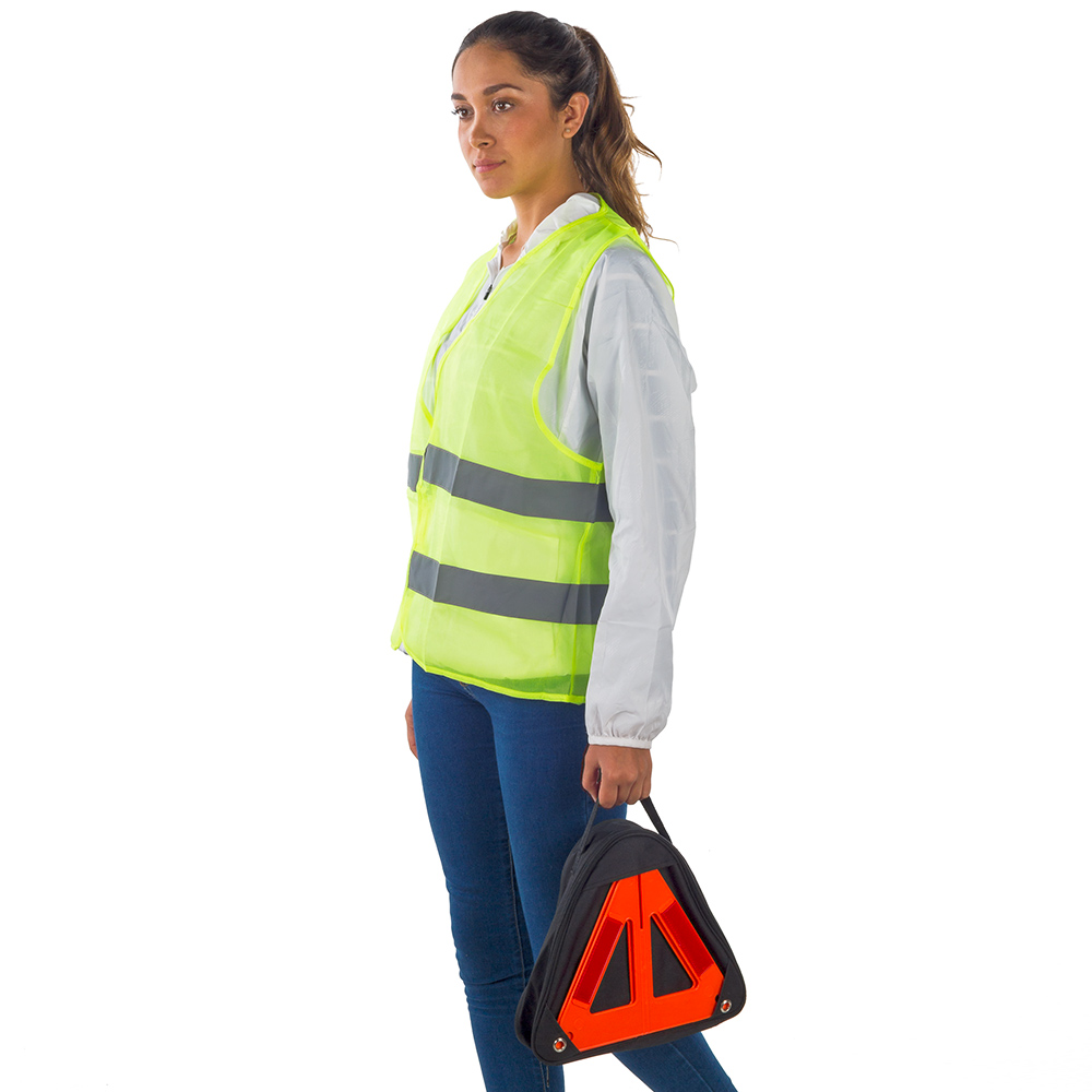 Incluye guantes, pinzas, chaleco de seguridad, linterna,destornillador, medidor de presión para llantas, triángulo reflectivo, y cables de emergencia. Estuche en poliéster.