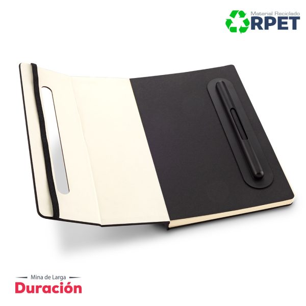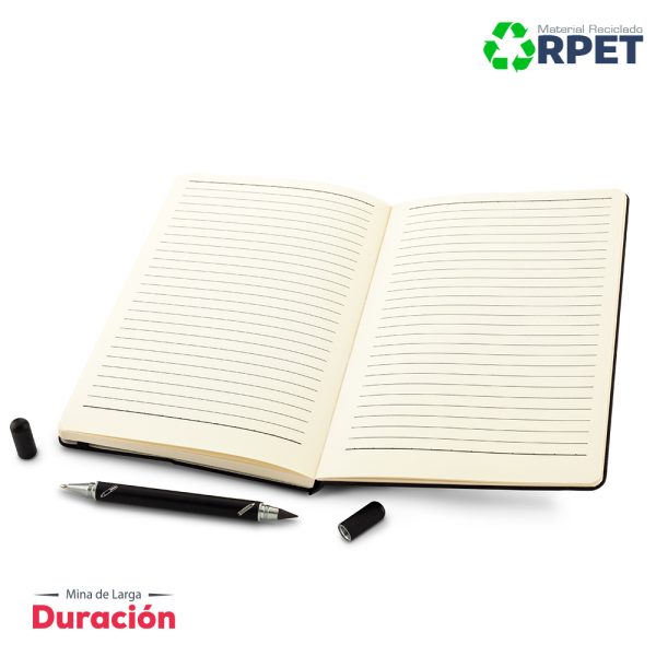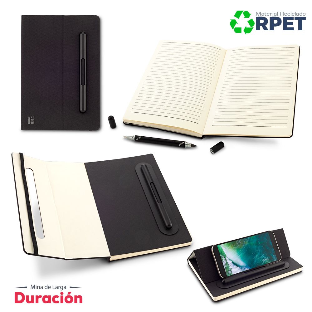 Libreta de 80 hojas, con cubiertas en poliéster reciclado RPET. Con soporte para telefono. Bolígrafo y lápiz tipo Iinfinity, con una mina que no se acaba fácilmente, no necesita usar tajalápiz. Con cierre elástico. Empaque caja individual.