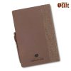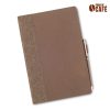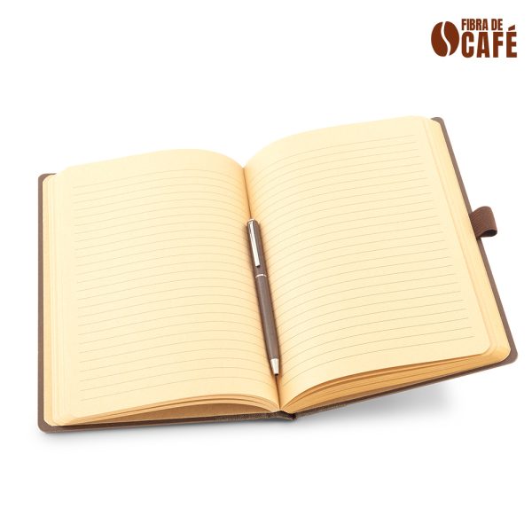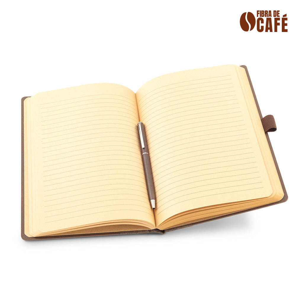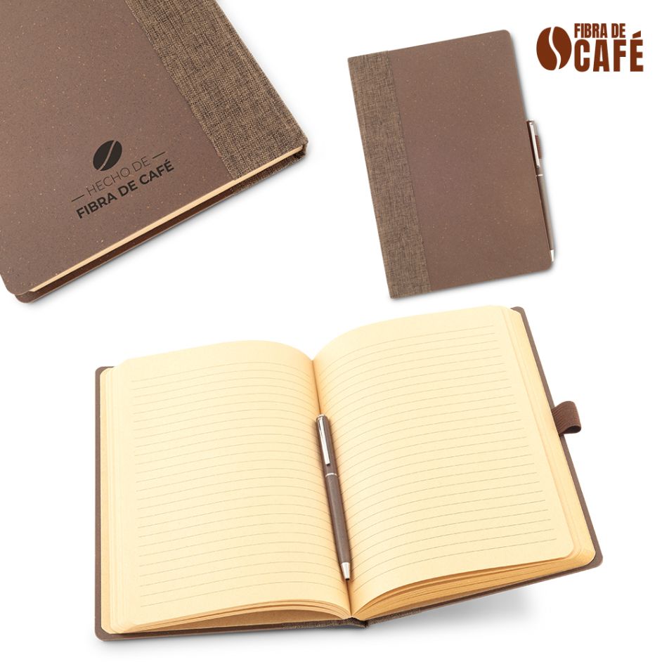 Libreta de 96 hojas (recicladas) con rayas, cubiertas plásticas hechas con 50%fibra de café. Incluye bolígrafo plástico hecho con 50% fibra de café. Mecanismo twist. El porcentaje de material ecológico tiene un promedio de biodegradabilidad de 2-3 años después del fin de su vida útil. Empaque caja individual.