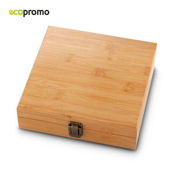 Juego de licorera en acero inoxidable de 177ml de capacidad, dos copas y mini embudo. 1 juego de cartas, 1 juego de dados. Empaque en caja de bambú. Caja individual.