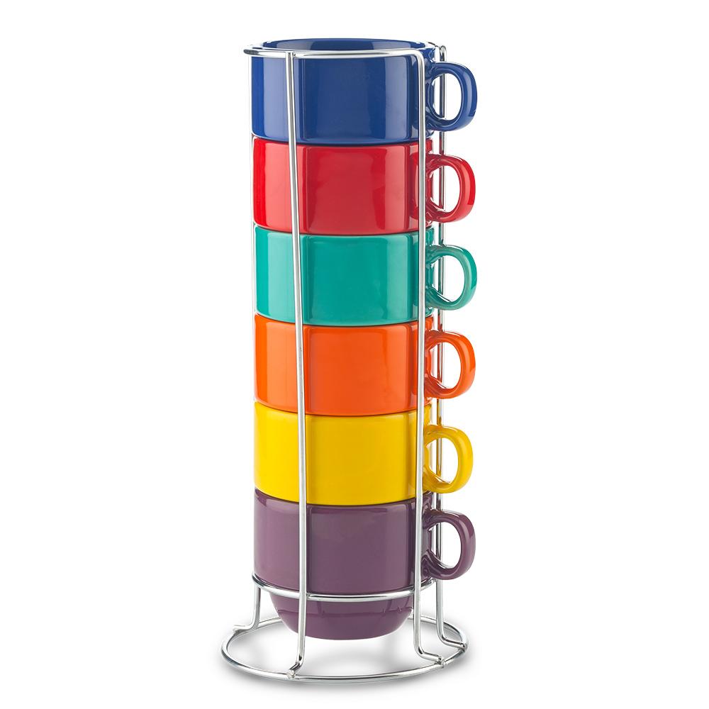 Set de 6 tazas en cerámica de 8oz, con base metálica para apilar. Empaque Caja Individual.