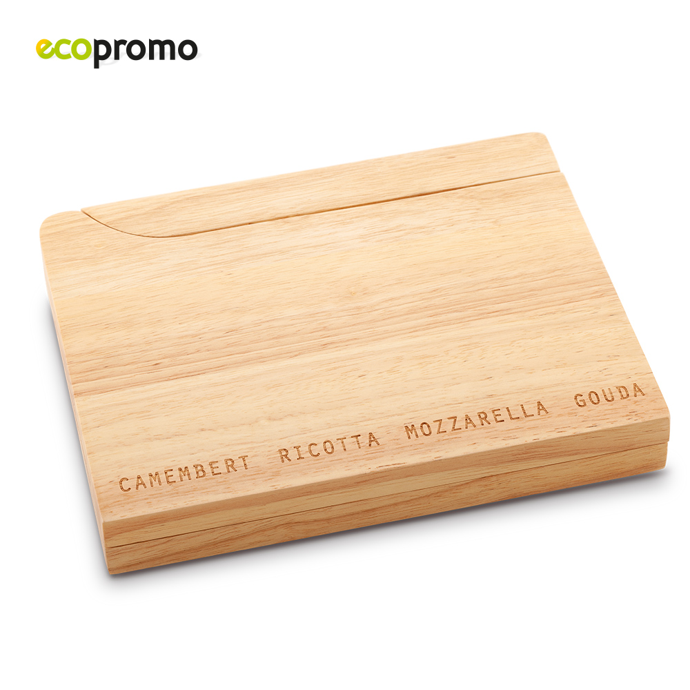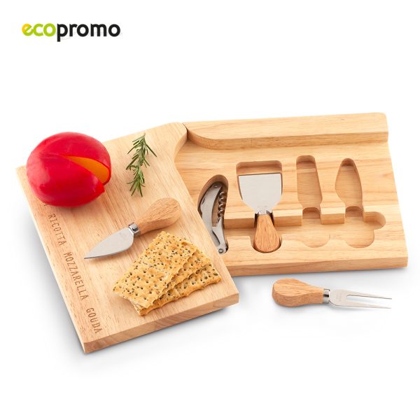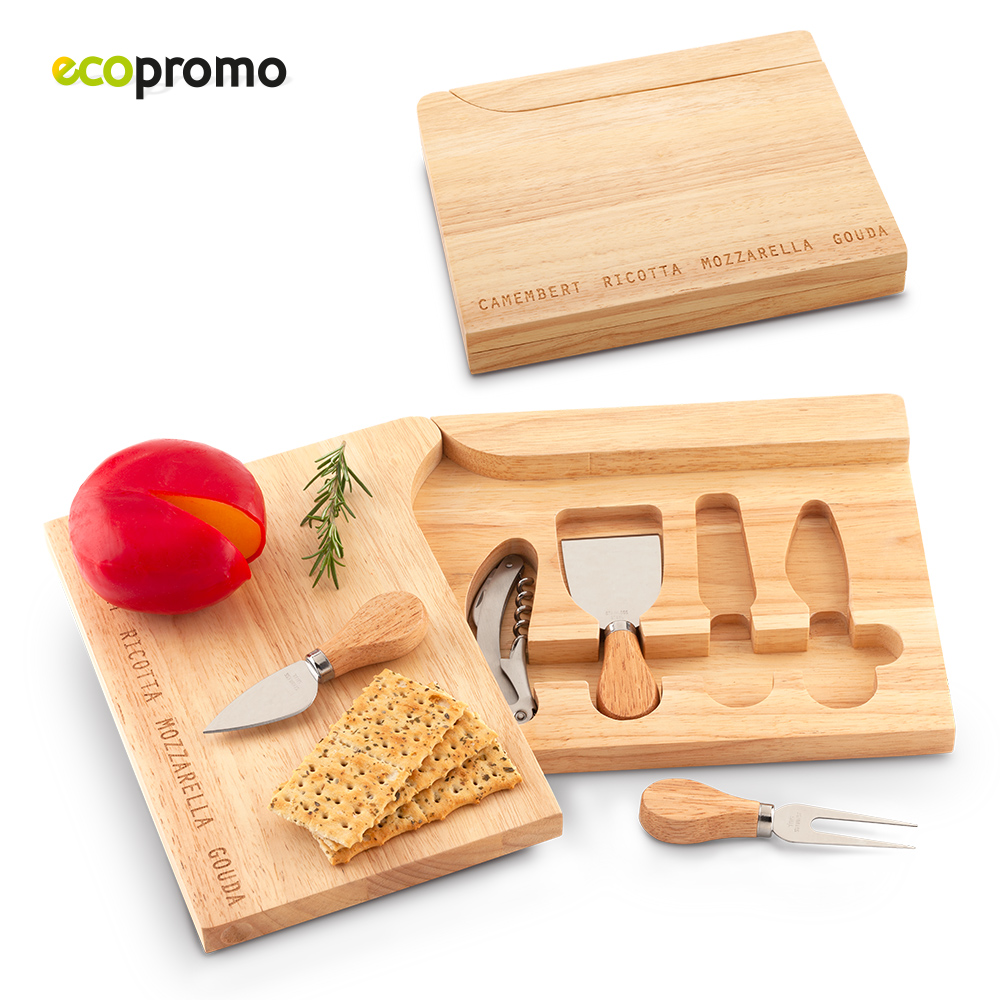 Set de madera para quesos, tabla y cuatro accesorios. Empaque caja individual.