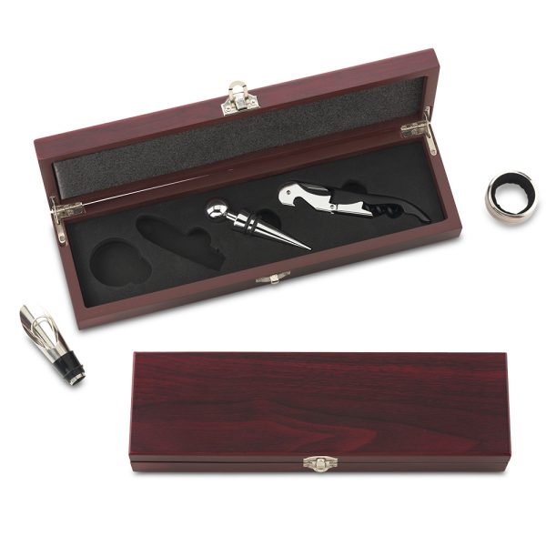 Set de vino en estuche en madera, 4 accesorios: dosificador, corcho, descorchador y argolla antigoteo. Empaque Caja Individual.
