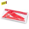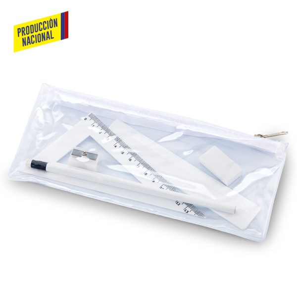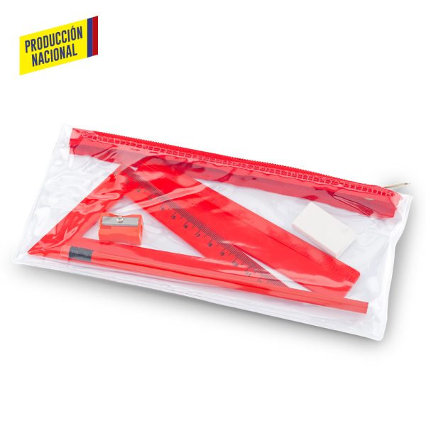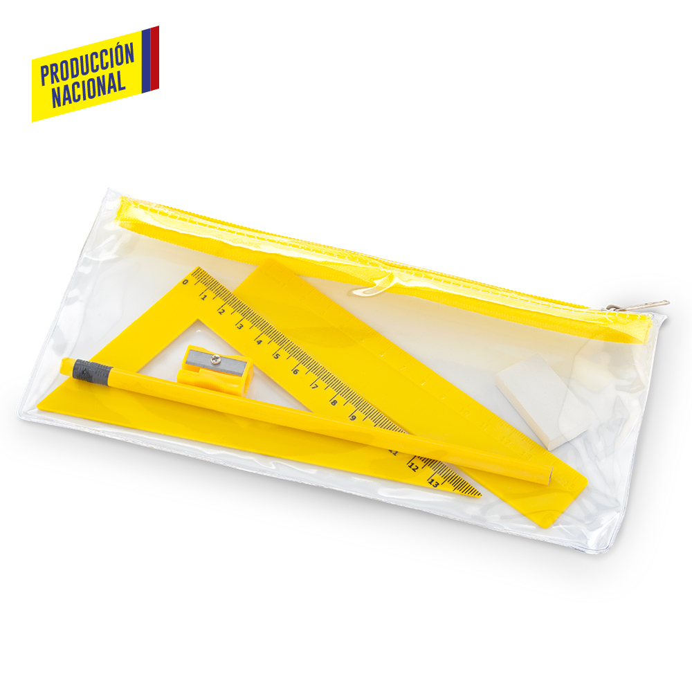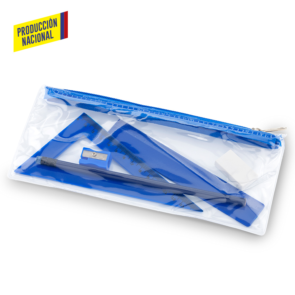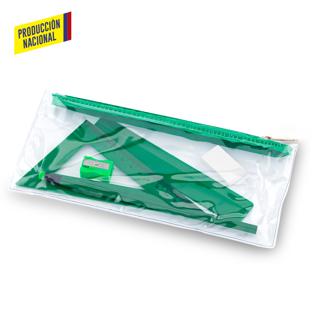 Set escolar en cartuchera plástica PVC con cierre de cremallera. Incluye: Lápiz, tajalápiz , regla de 15cm, escuadra de 15cm y borrador