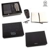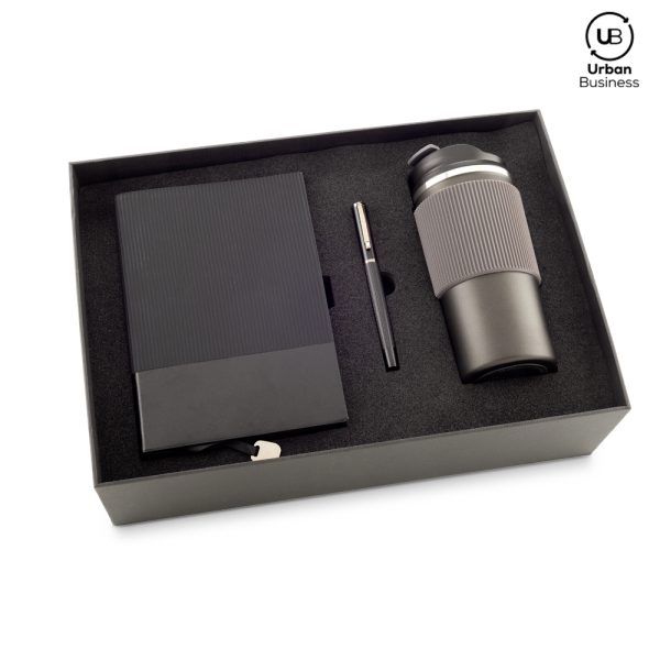 Set de libreta de 21 cm x 14.5 cm de 96 hojas rayadas con cubierta en poliueretano, mug de 500 ml, doble pared en acero Inoxidable, con aislamiento térmico que mantiene la bebida fría o caliente hasta 6h aprox (puede variar dependiendo de condiciones climáticas), tapa pestaña y grip de silicona para mejor agarre. Bolígrafo metálico roller. Empaque caja individual.