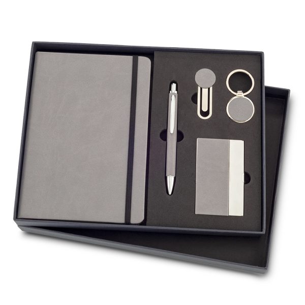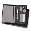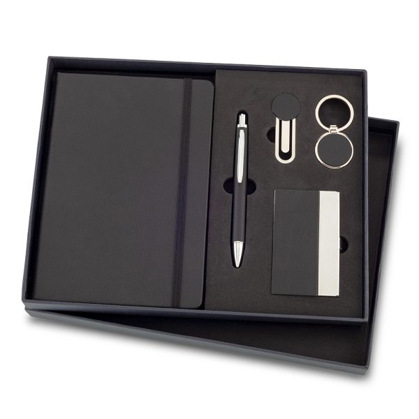 Set de libreta con cubierta en PU, 96 hojas rayadas, bolígrafo, clip separador de páginas, llavero y portatarjetas. Empaque caja individual.