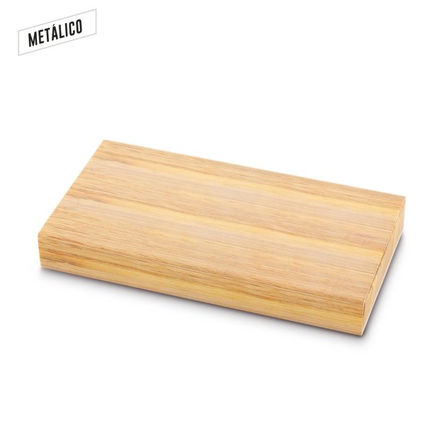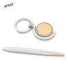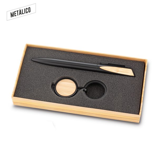 Set de bolígrafo metálico con clip metálico y aplique en bambú, llavero en bambú con metal. En estuche con papel imitación bambú. Empaque caja individual.