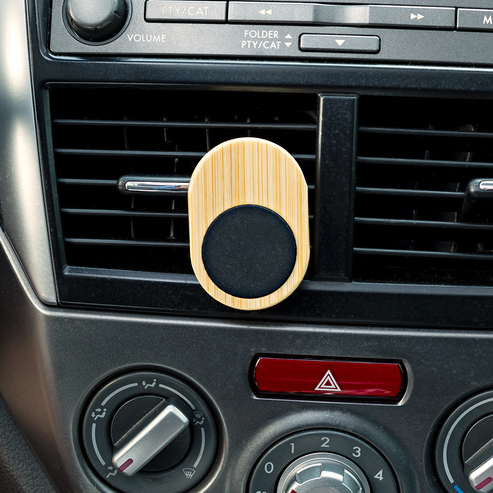 Soporte magnético para carro en bambú, con adhesivo 3M. Empaque caja individual.