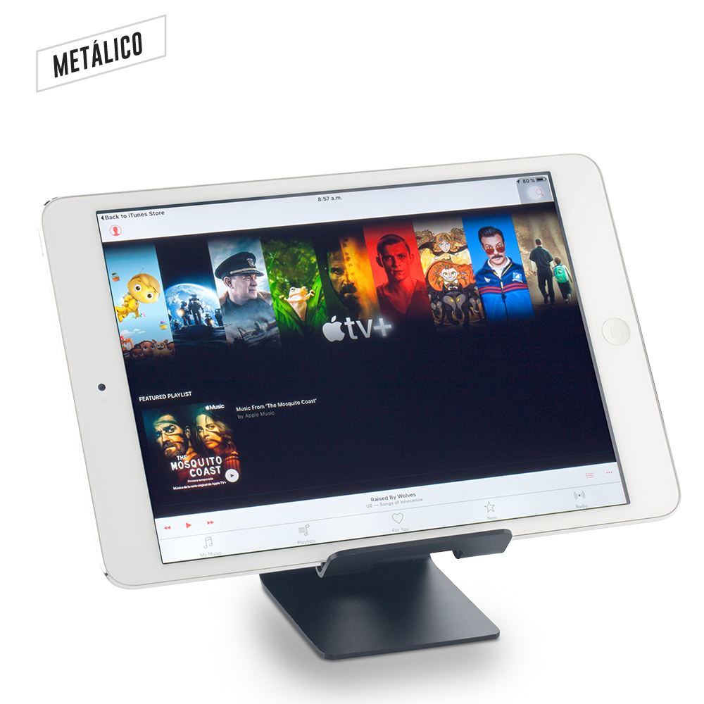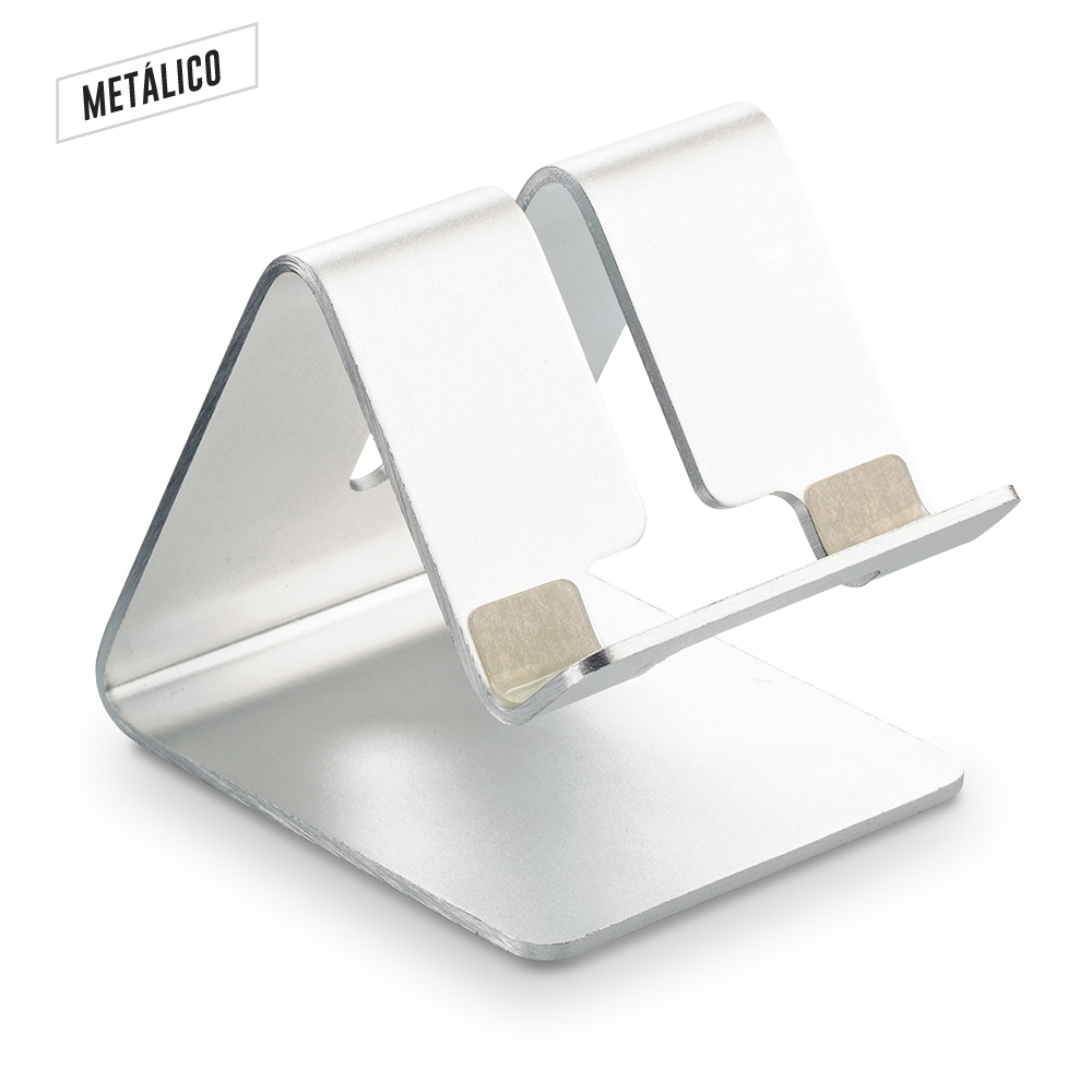 Soporte metálico para dispositivos móviles. Antideslizantes en silicona en la parte inferior. Se sugiere su uso con dispositivos de hasta 8 pulgadas y 320g aprox. Empaque caja individual.