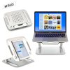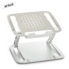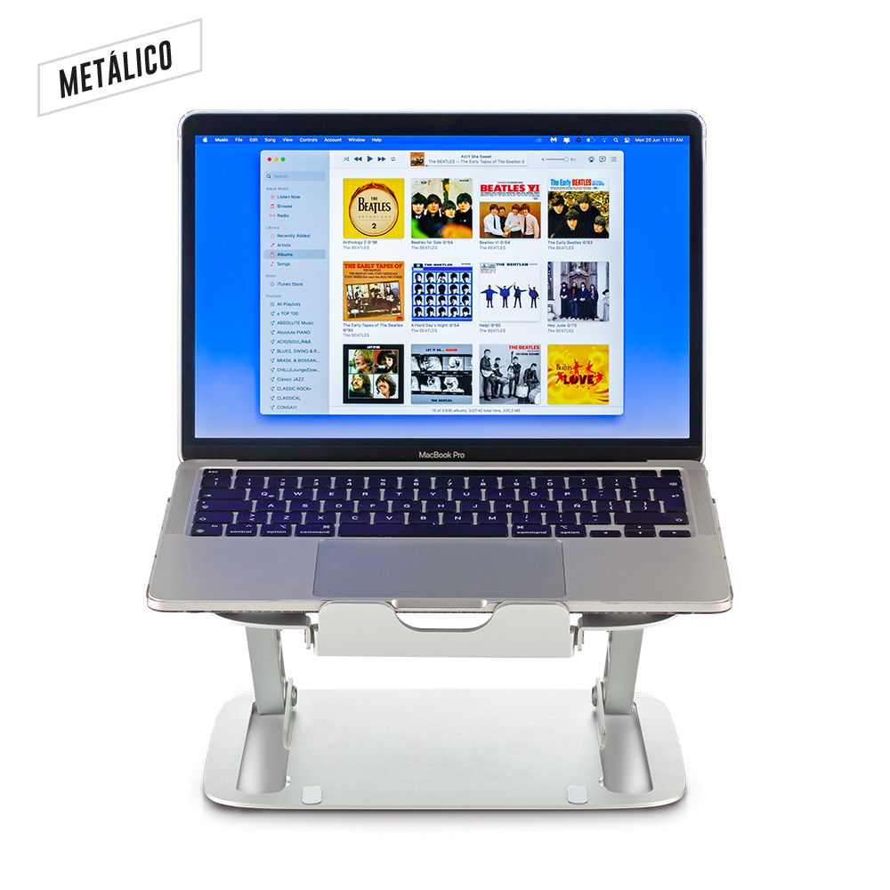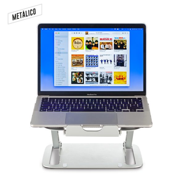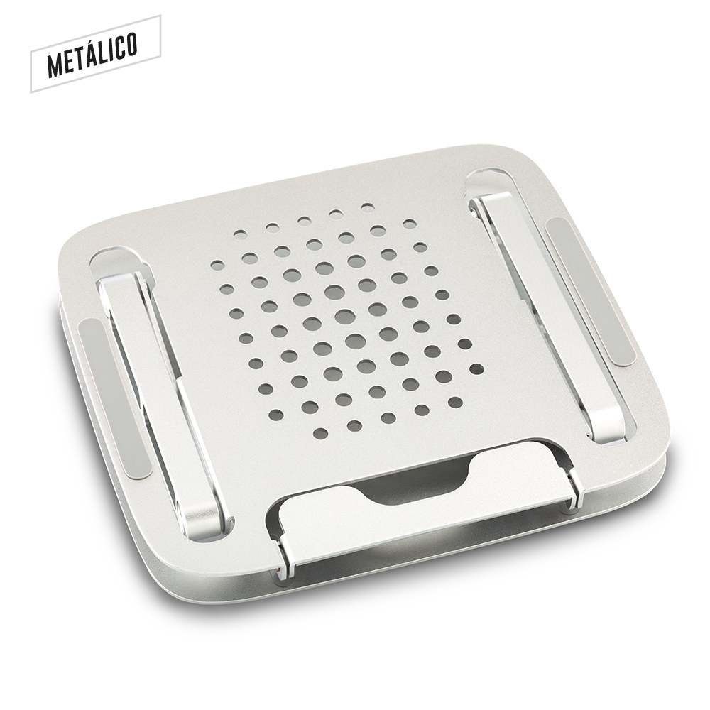 Soporte Portátil Plegable en Aluminio. Ligero, con ajuste de altura y puntos antideslizantes para posicionar el portátil y bajo la base. La posición del dispositivo sobre el soporte ayuda a que no se recaliente, mejora la posición de la columna vertebral y reduce la fatiga de cuello, espalda y ocular. Se sugiere usar en dispositivos de hasta 16 pulgadas. Empaque caja individual.