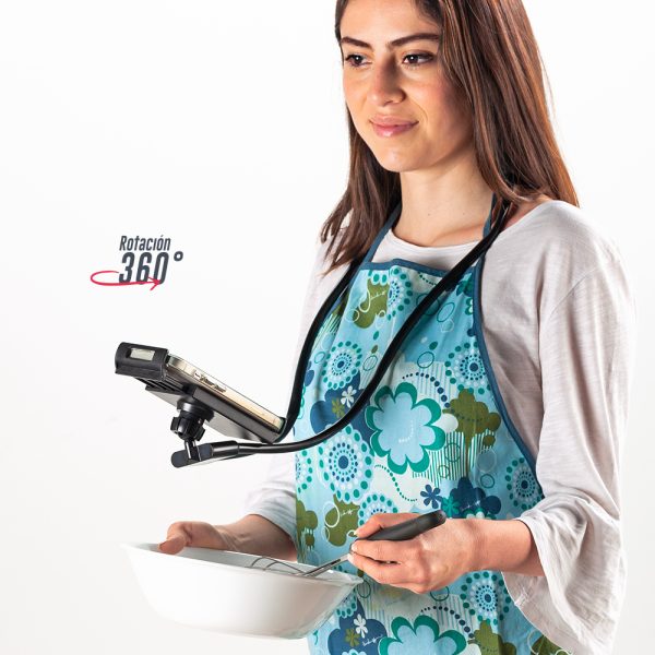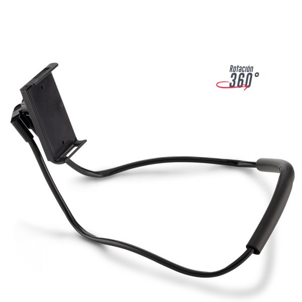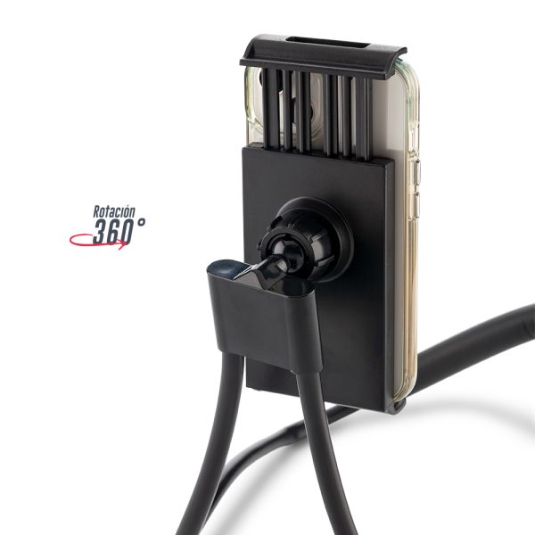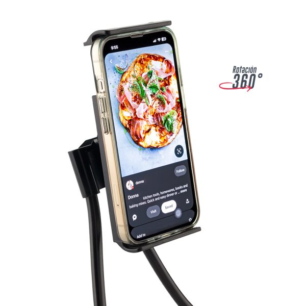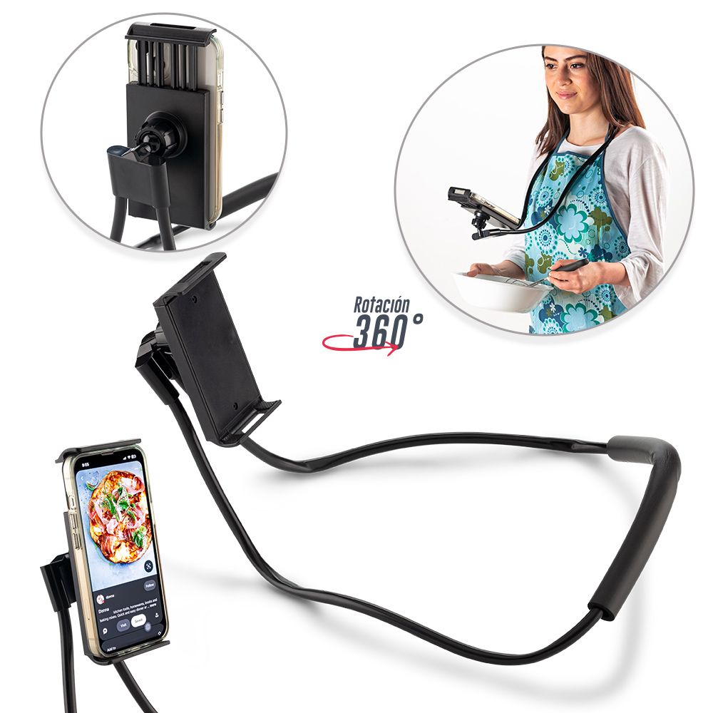 Soporte plástico flexible para móviles. Altura ajustable, con espuma suave para más comodidad. Permite rotación de 360°. Empaque caja individual.
