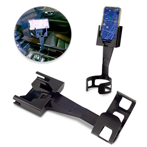 Soporte para móviles en plástico. Parte inferior del soporte se fija en el portavasos del carro. Empaque caja individual.