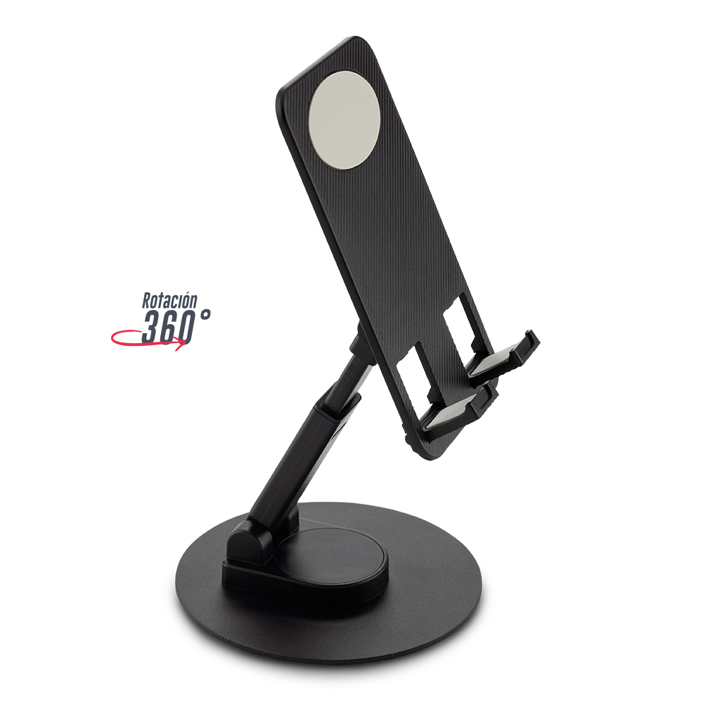 Soporte plástico, plegable y escualizable con rotación de 360°. Accesorios antideslizantes en silicona. Empaque caja individual.
