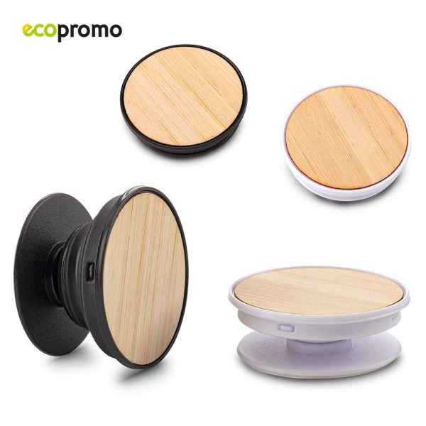 Soporte plástico expandible para móviles con partes en bambú, con adhesivo 3M. Funciona como organizador de cables. Empaque bolsa individual.