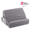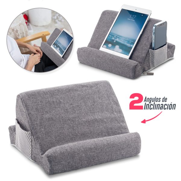 Soporte tipo almohada que sostiene los dispositivos de una forma ergonómica. Cada lado del soporte tiene un ángulo diferente para visualizar el dispositivo o acomodarse de la forma más cómoda y ergonómica. La funda se puede retirar y es lavable.