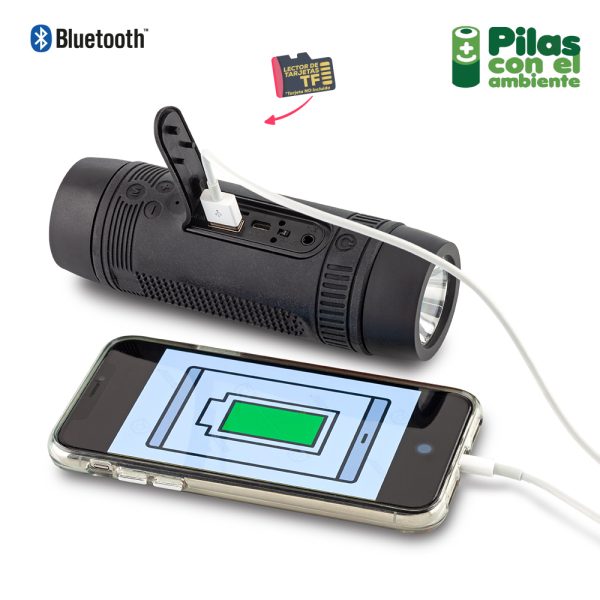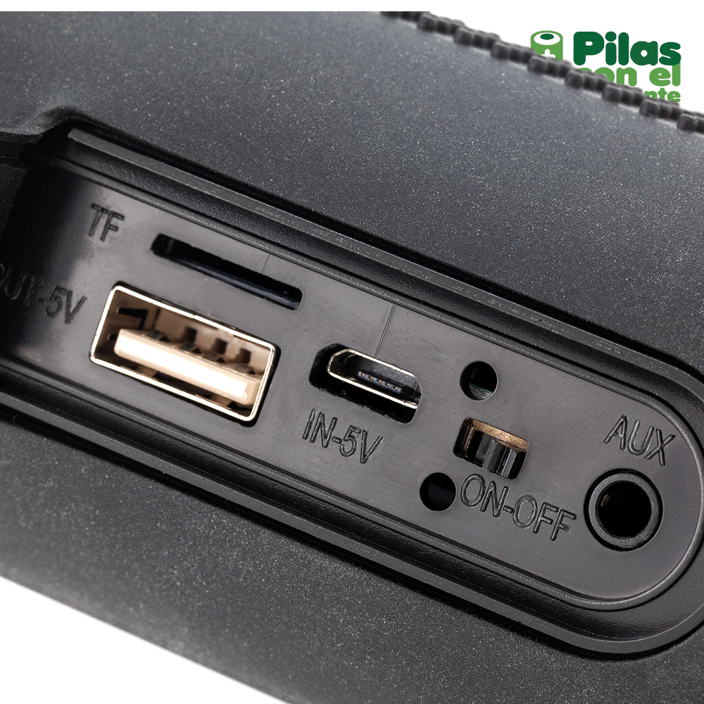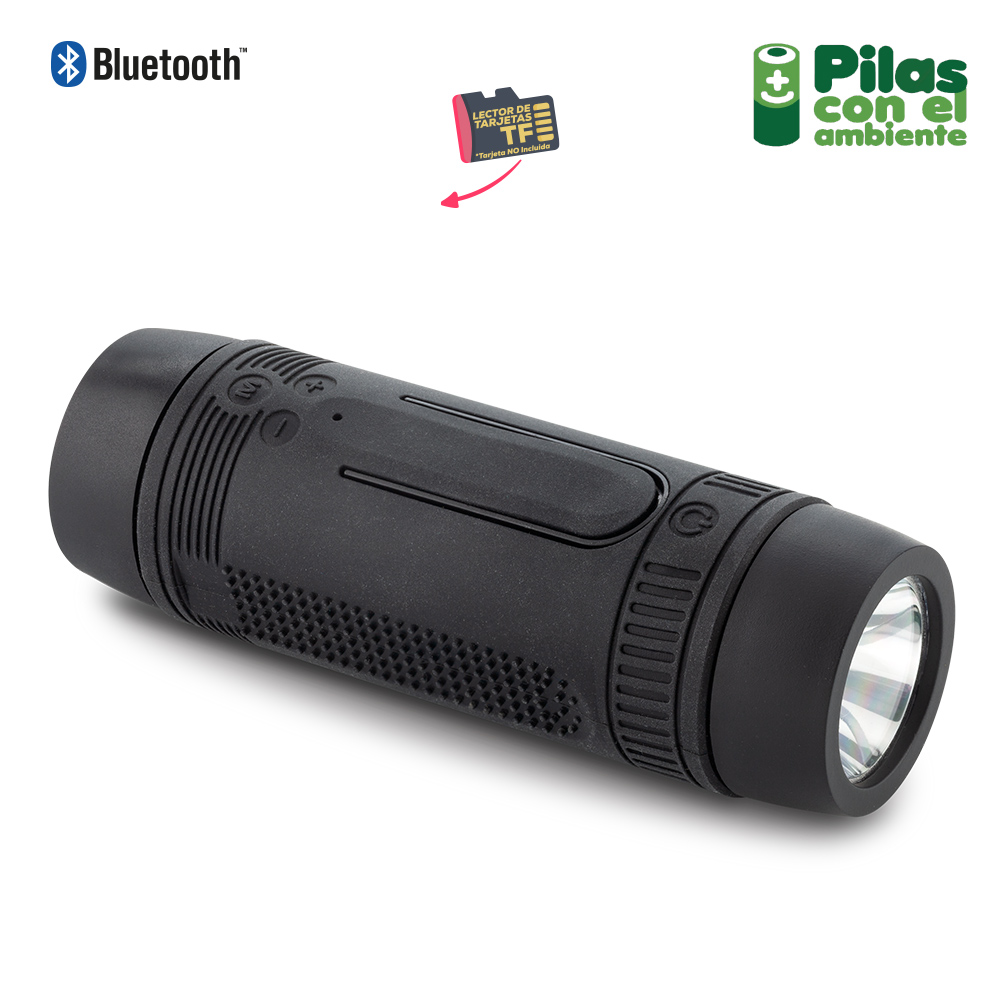 Speaker Bluetooth 1x3W, con lector de tarjeta SD, lector AUX y USB (tarjeta no incluida), linterna LED y pila recargable de 2.500mAh. Voltaje de salida: 5V/1A SNR: 290dB. Rango de trabajo: 10M Distorsión: 1%. Respuesta de frecuencia: 20Hz-20KHz. Empaque caja individual.
