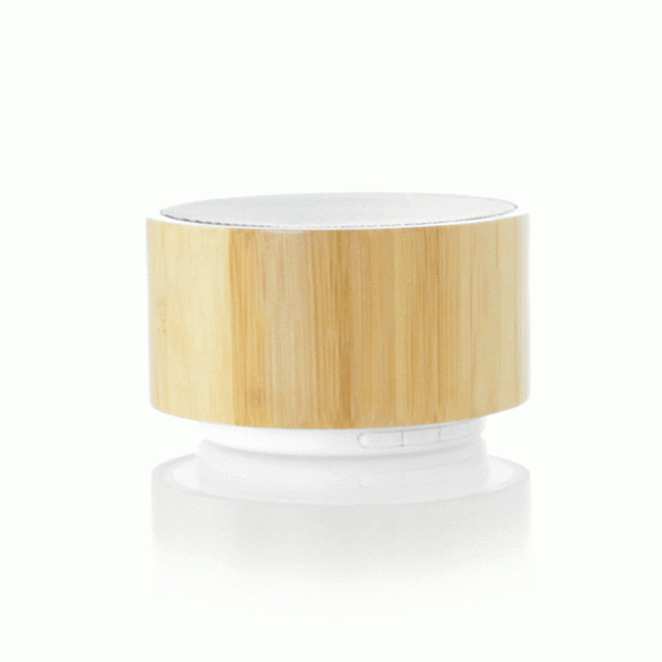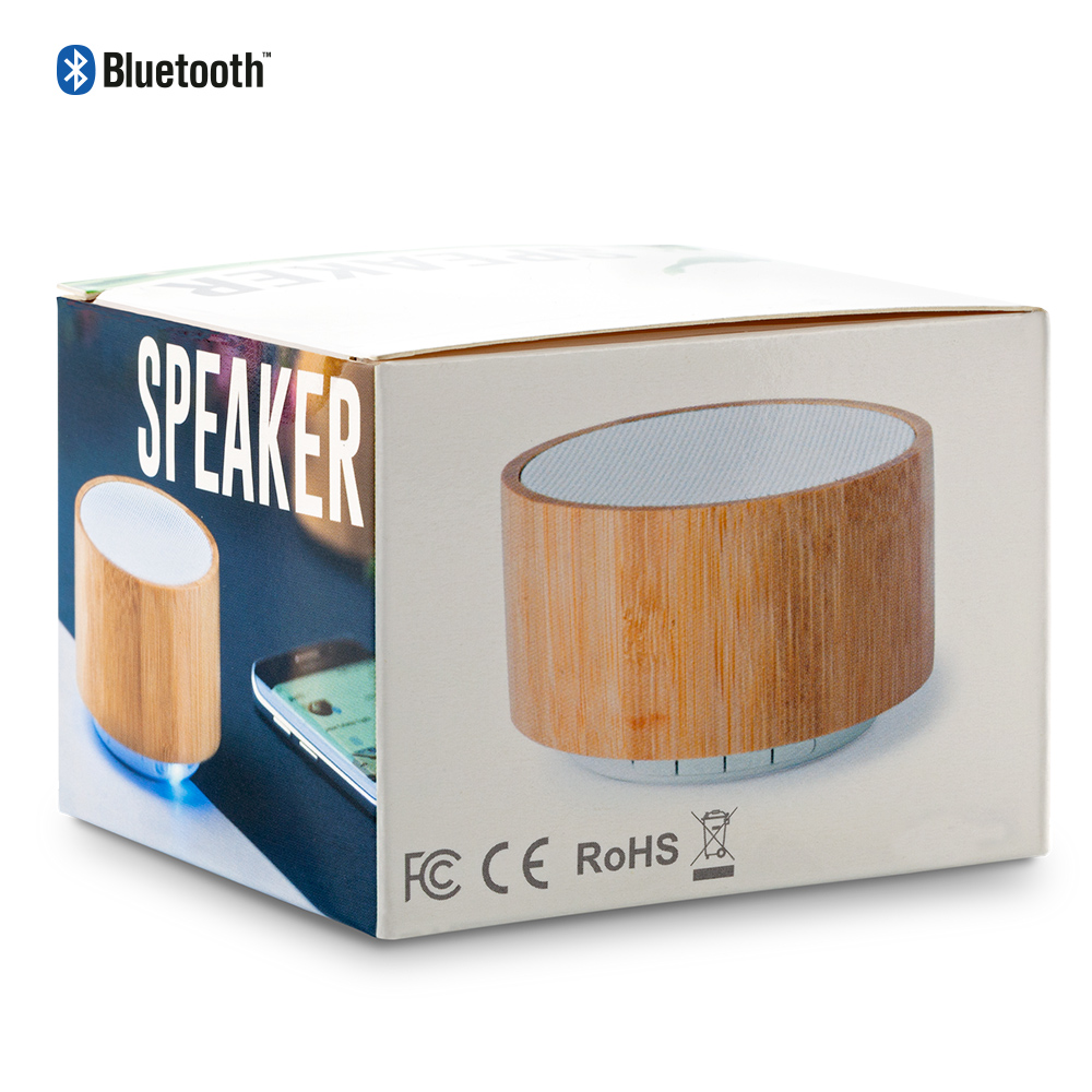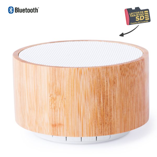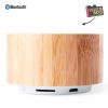 Speaker con cuerpo en bambú y conexión Bluetooth 1X3W, funciona como manos libres, ranura para tarjetas mini SD (tarjeta no incluida) y base antideslizante. Empaque caja individual.