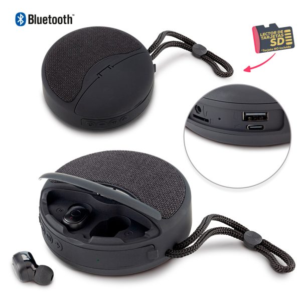 Speaker Bluetooth plástico de 3W con lector de tarjeta y USB (no incluidas). Cuenta con audífonos bluetooth incorporados en la parte superior. Funciona como manos libres.
