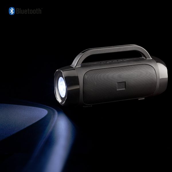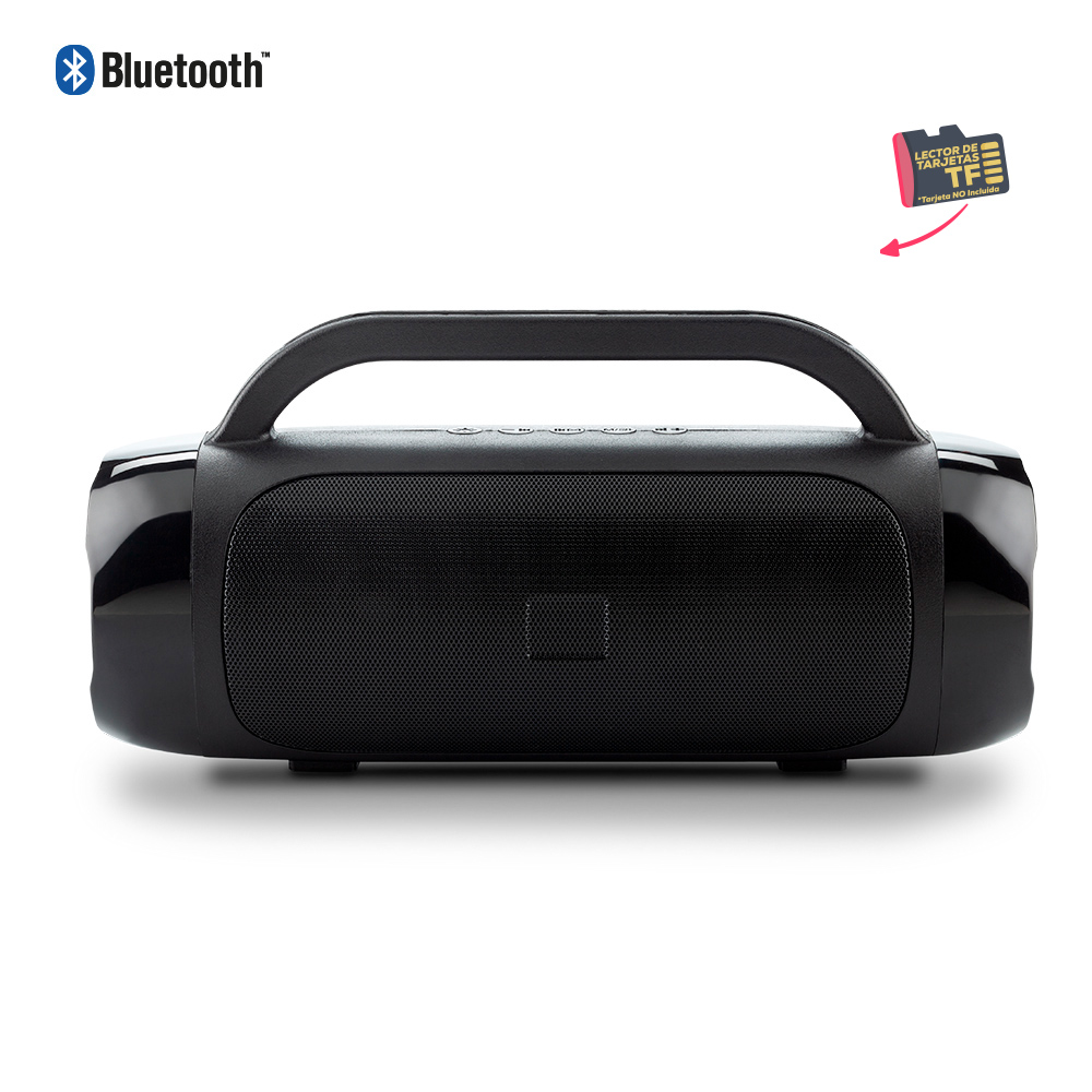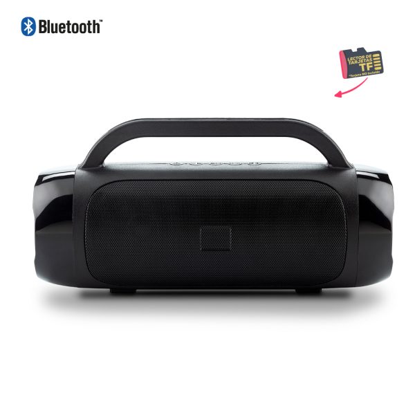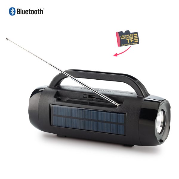 Speaker Bluetooth 1x5W, con batería interna de 1200mAh, radio FM, linterna LED y panel de energía solar para recarga de emergencia. Lector de tarjeta TF y USB (tarjeta o USB (no incluidas)), entrada AUX. Empaque caja individual.