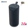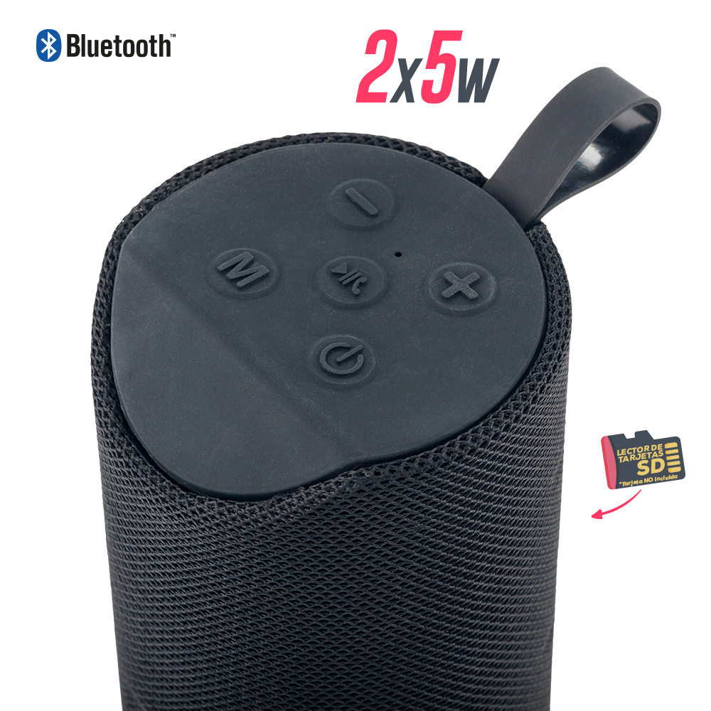 Speaker bluetooth plástico con acabado caucho, 2x5W, funciona como manos libres. Lector de tarjeta SD y USB (no incluidas), cable AUX. Empaque caja individual.
