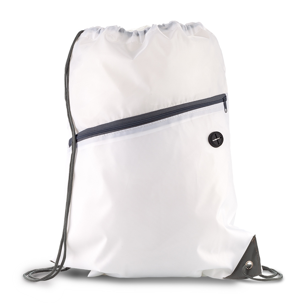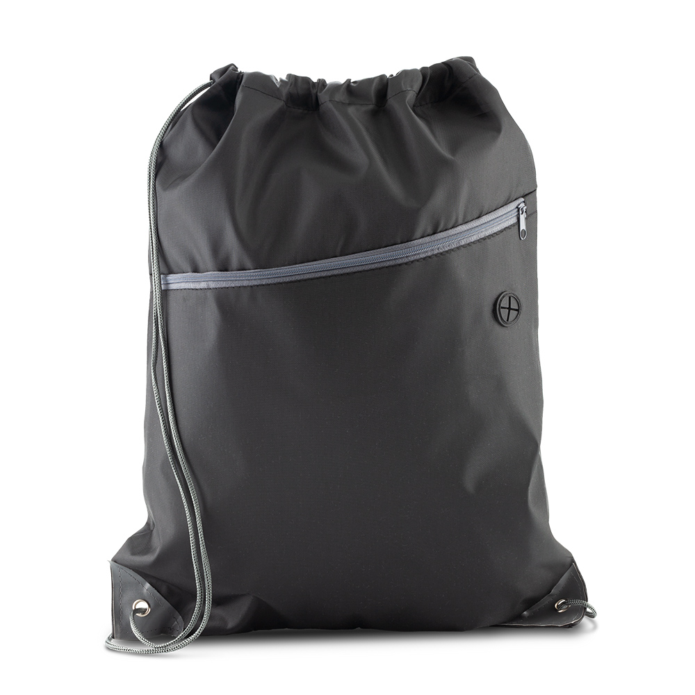 Tula morral en lona poliéster 210D con bolsillo de cremallera y salida para audífonos.