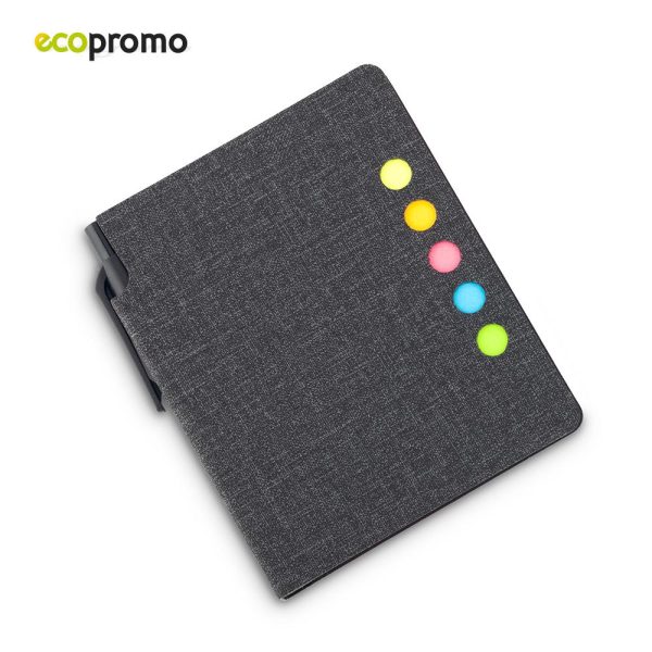 Set de cartón con cubierta de tela, con 5 stickies de colores, taco de papel autoadhesivo de 48 hojas y bolígrafo.
