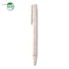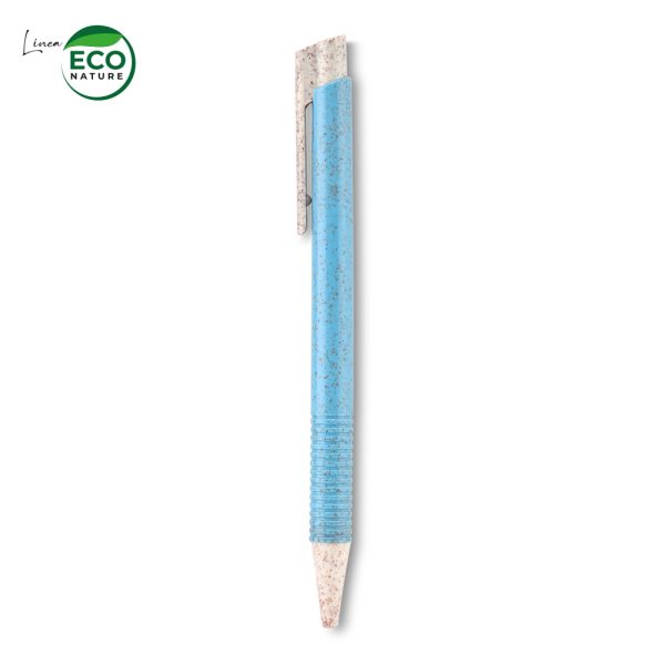 Bolígrafo plástico. Mecanismo push. Mezcla con material ecológico en fibra de trigo (50%-60% aprox). El porcentaje de material ecológico tiene un promedio de biodegradabilidad de 2-3 años después del fin de su vida útil.