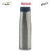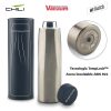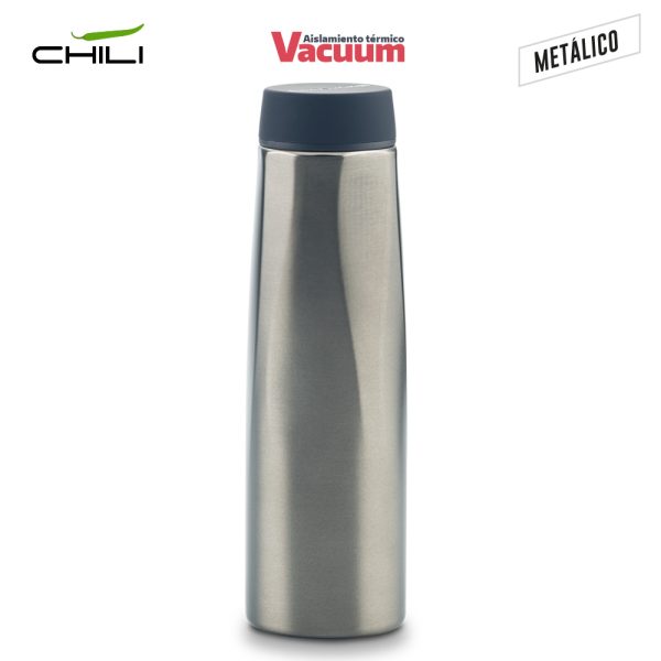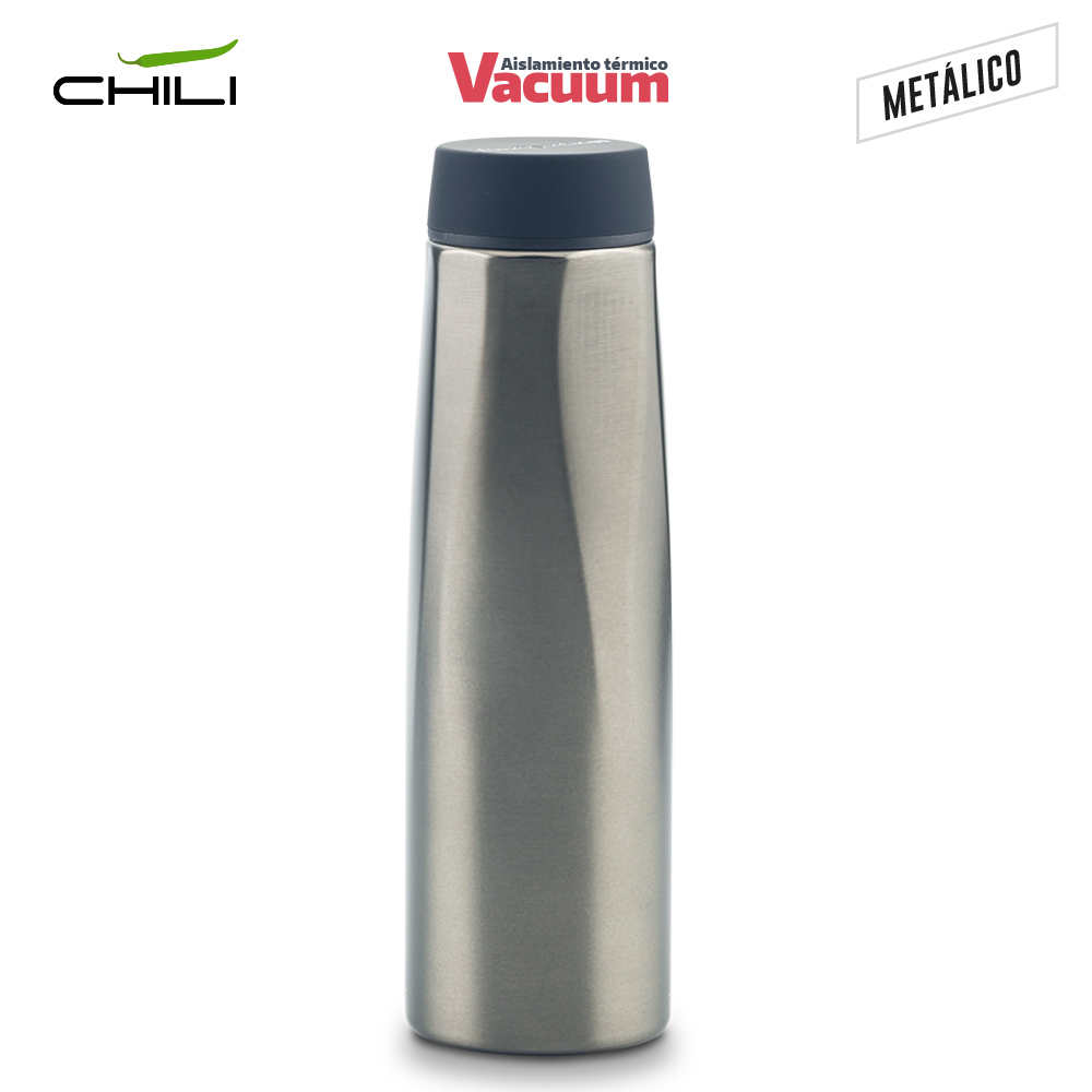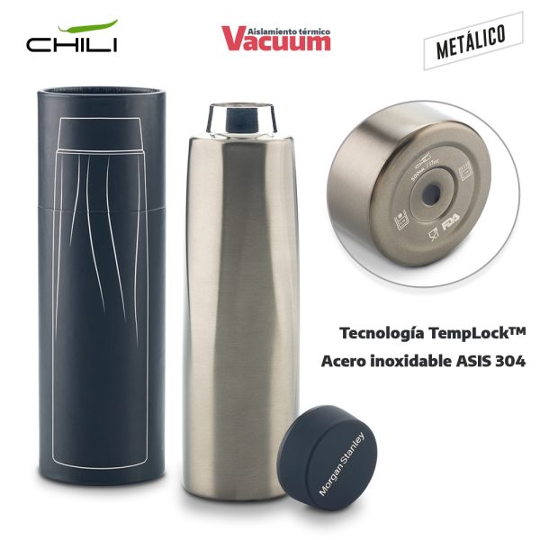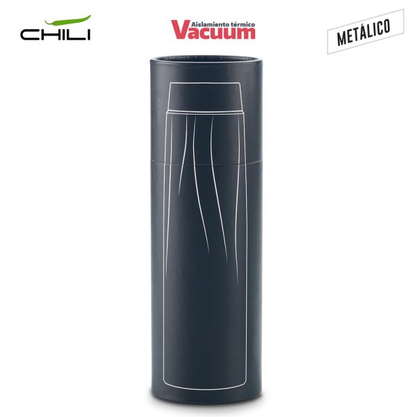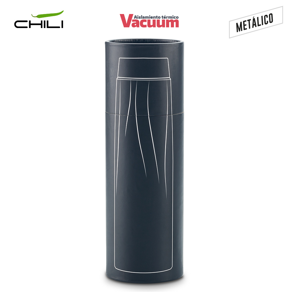 Termo doble pared en acero inoxidable, tapa rosca y cierre a presión. Con aislamiento térmico. Tapa rosca metálica con recubrimiento en caucho. Estuche individual tubular en cartón negro.