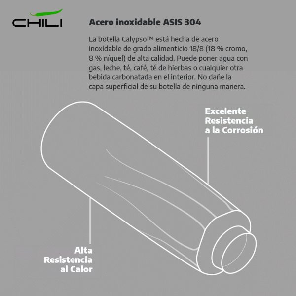 La botella Calypso™ está hecha de acero inoxidable de grado alimenticio 18/8 (18 % cromo, 8 % níquel) de alta calidad. Puede poner agua con gas, leche, té, café, té de hierbas o cualquier otra bebida carbonatada en el interior. No dañe la capa superficial de su botella de ninguna manera.
