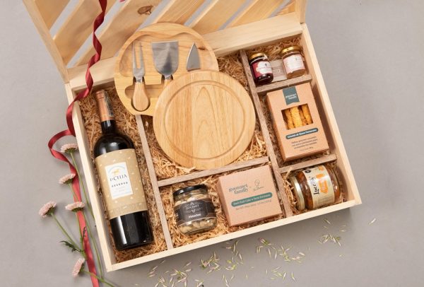 Vino (750 ml), set de quesos en madera, pistachos (50g