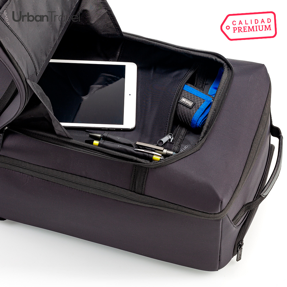 Morral tipo trolley en poliéster, para portátil de 15”. Compartimento principal con cierre de cremallera y bolsillo frontal con organizador.