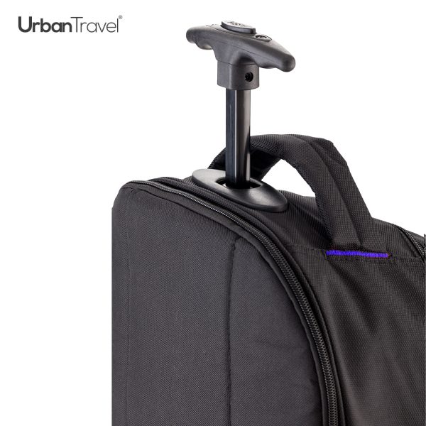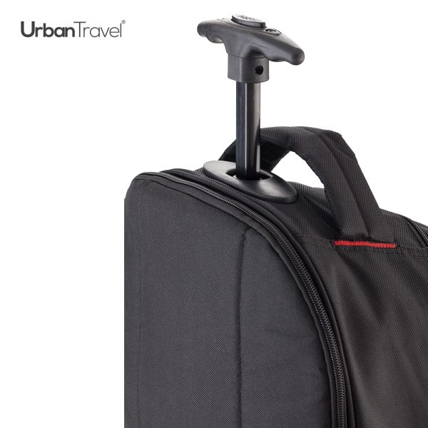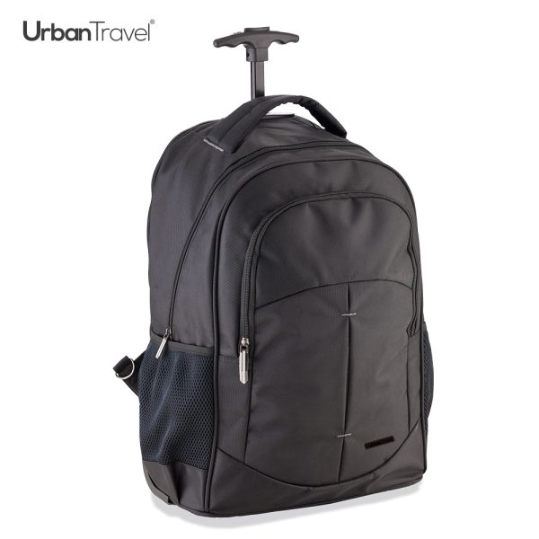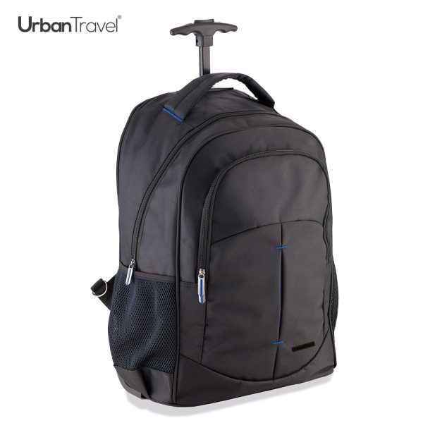Trolley backpack en poliéster 1680D con dos compartimentos, bolsillo para portátil y dos mallas laterales.